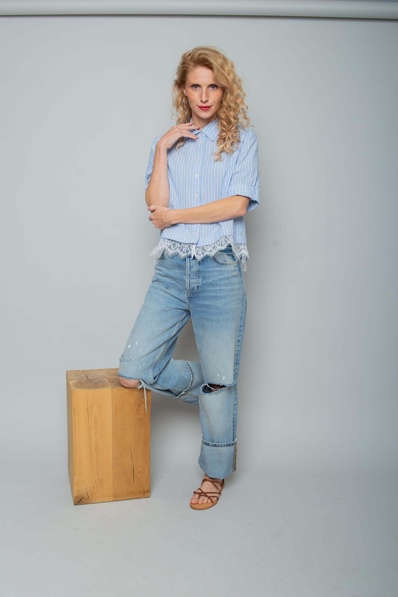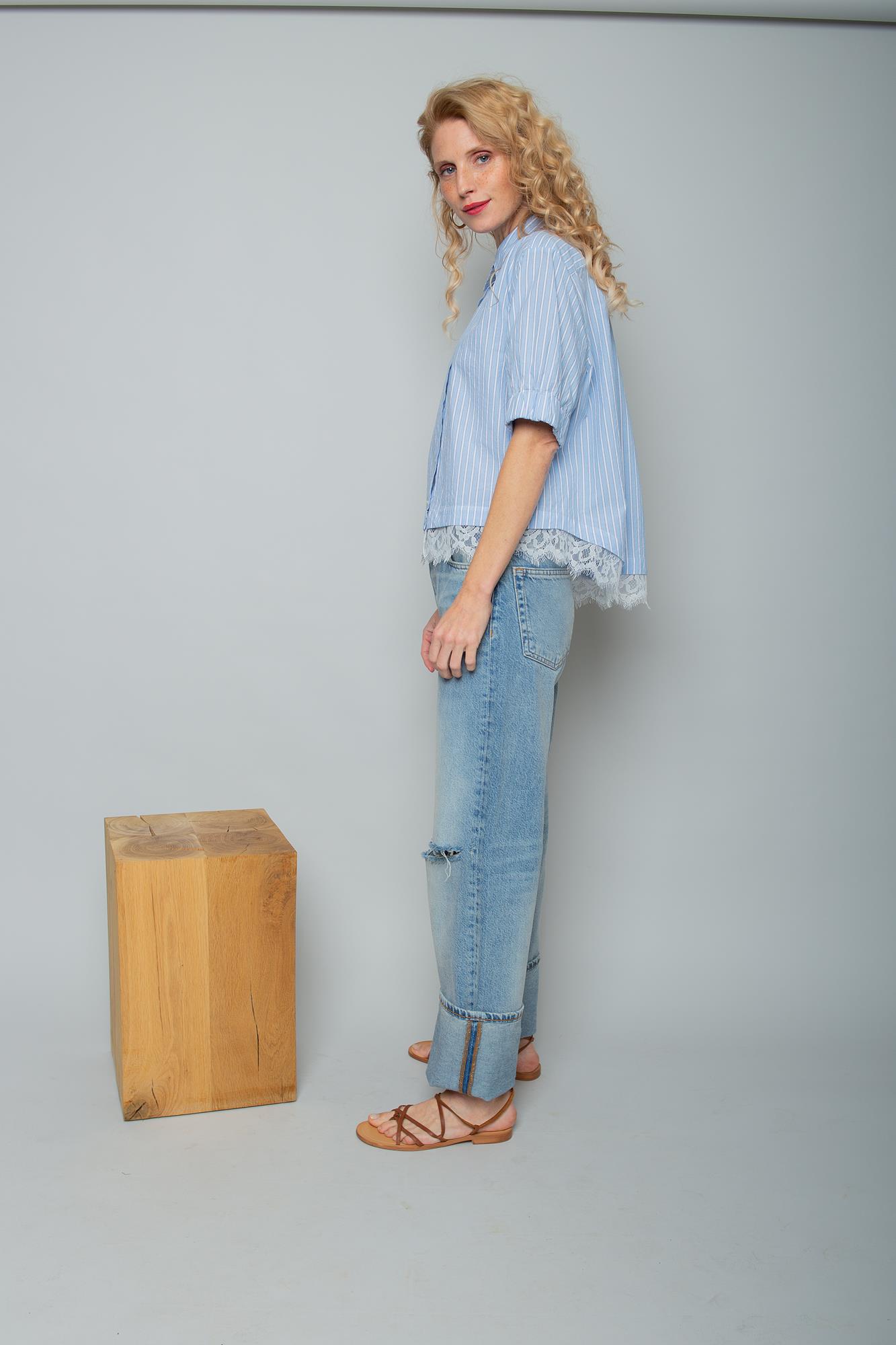 Emily van den Bergh – Gestreifte Bluse mit Spitzenbesatz in Blau/Weiß
