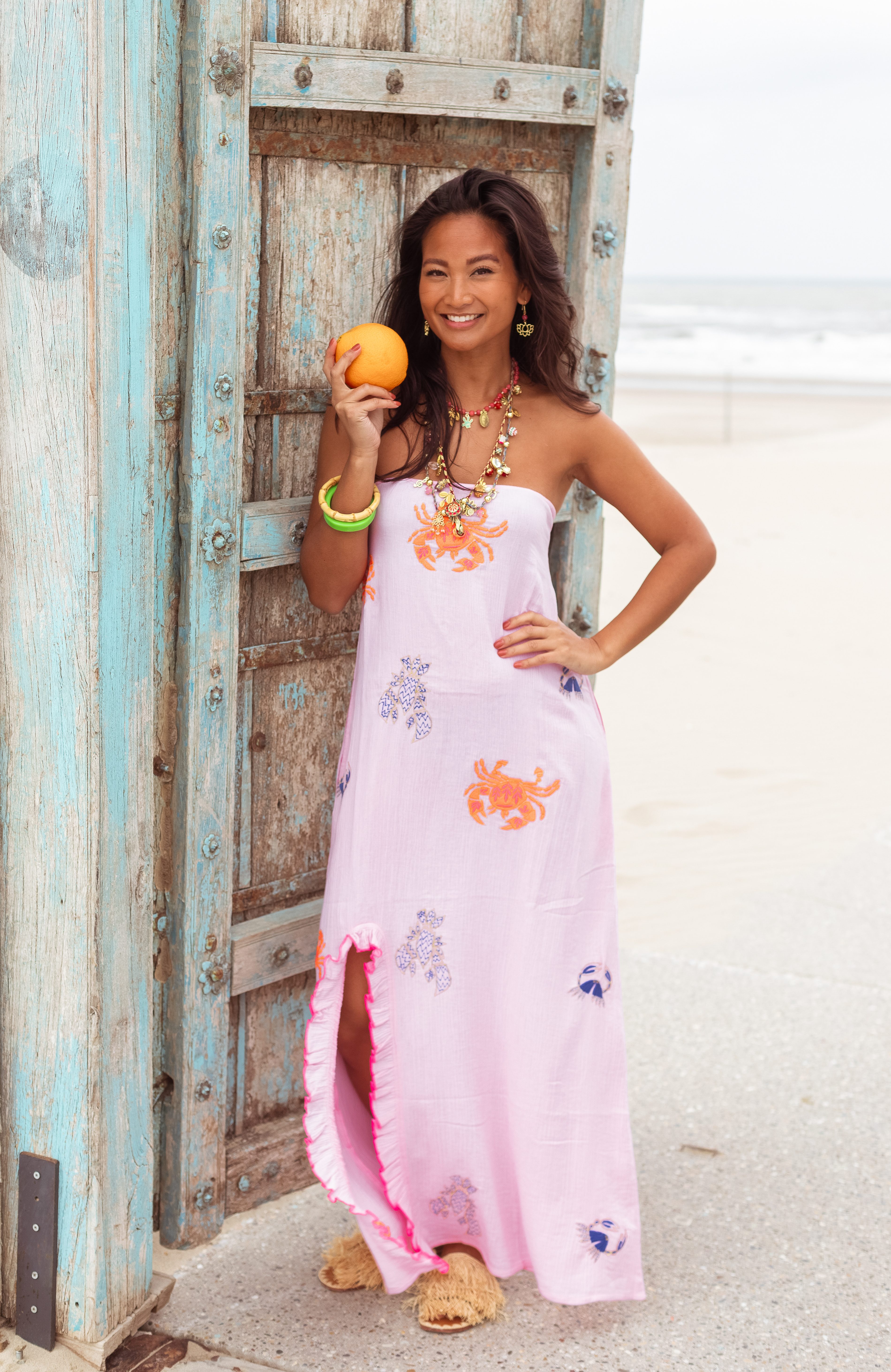Place du Soleil – rosa Bandeukleid mit Krabbenstickerei